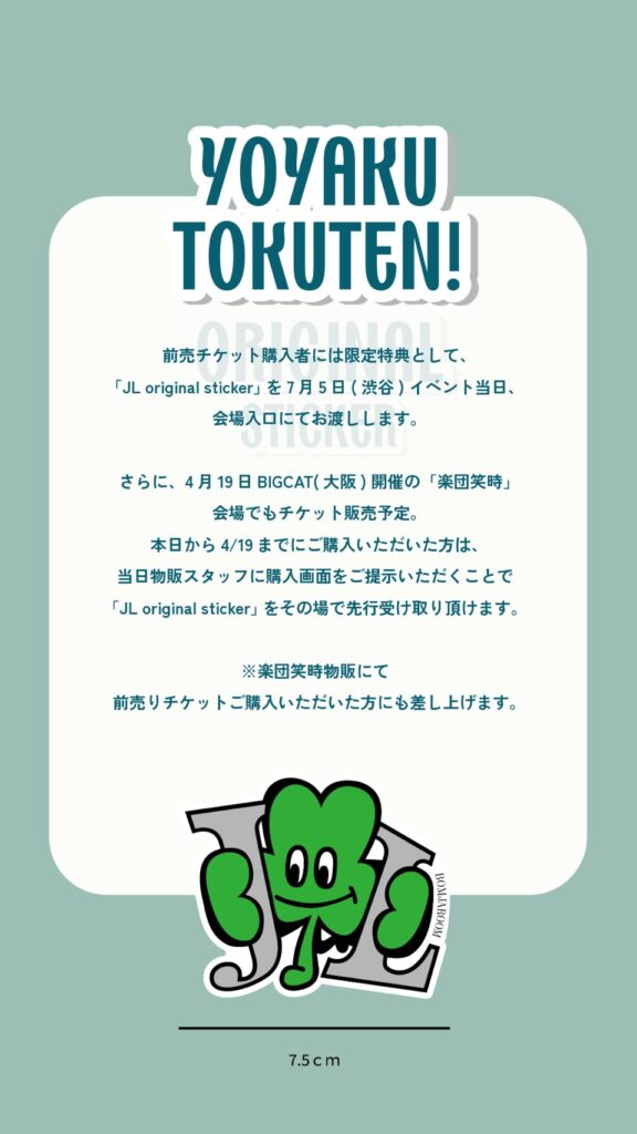 チケットの先行受付も本日よりイープラスで開始された。 前売チケット購入者には、限定特典として「JL original sticker」 がイベント当日に会場の渋谷WWW Xで配布される。また、4月19日(日)大阪BIGCATで開催される公演「楽団笑時」の会場でも「BOMJAROOM」のチケットを販売予定。4月19日(日)までに「BOMJAROOM」のチケットをご購入いただいた方は、当日物販スタッフに購入画面をご提示いただくことで「JL original sticker」 を先行で受け取ることができる。